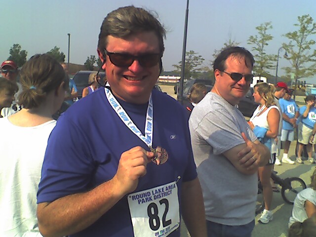 I finished in 30:47 and am shown clutching my bronze medal for my age group! Looking on bemused is former Round Lake Trustee Dale Multerer who is on the Round Lake Area Park District Foundation Board now as well as serving as a Police Commission Board member for the village! I saw quite a few friends and acquaintances, Chicky Johnson, Jeanne and Judge Goshgarian, Trustee Jerry Shaw and tons of people supporting this wonderful event.