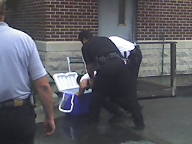 Have had a busy weekend already and its only Saturday. The first two pictures are of the giant polished jelly bean like structure at the Millennium Park in downtown Chicago. Quite shiny! Trustee Sherry Perkowitz and I were hunting contact solution down for her when we decided to take a short cut through the park. The picture where two of my officers are shoving the head of our newest officer into the cooler is just that! However the new officer had just completed his pepper spray training by getting pepper sprayed. Not a job for the faint of heart.